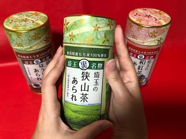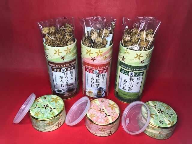 - セット内容: 小粒せんべい×3種類(狭山茶・和紅茶・塩味ほうじ茶)、保管用の茶筒3本付き